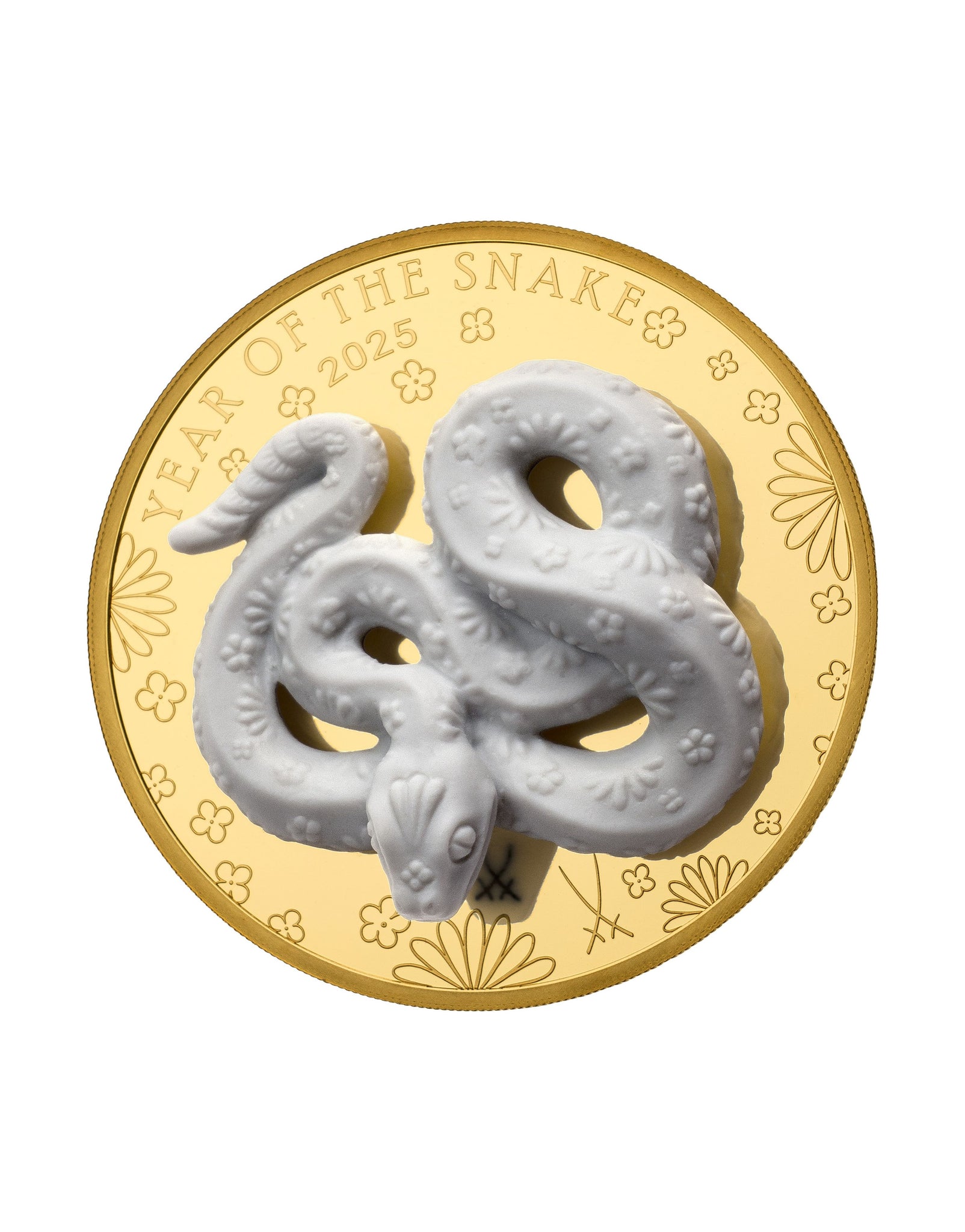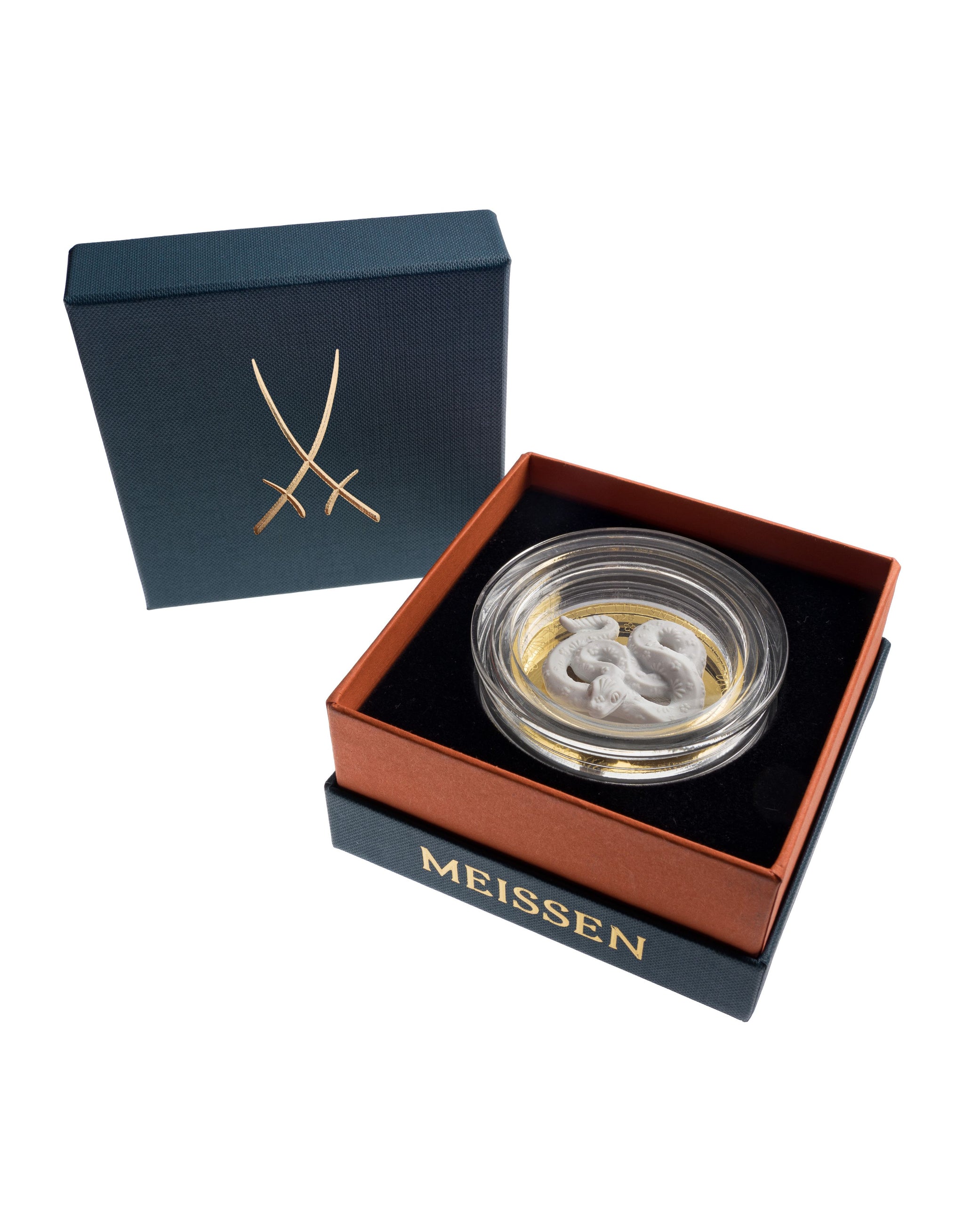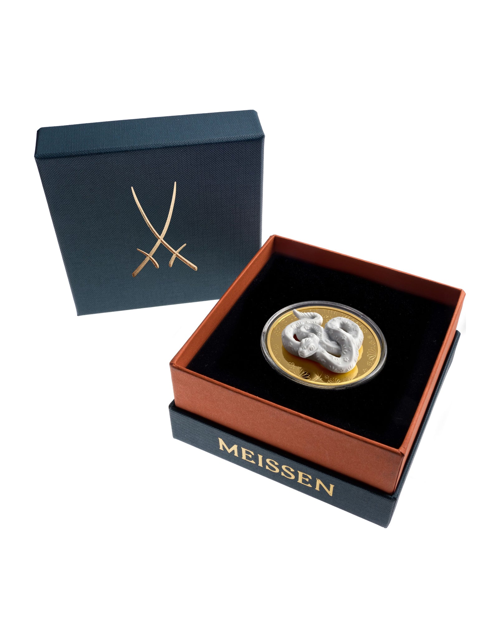 Einzigartige Goldmünze mit einem handgefertigter Meissener PorzellanSchlange.